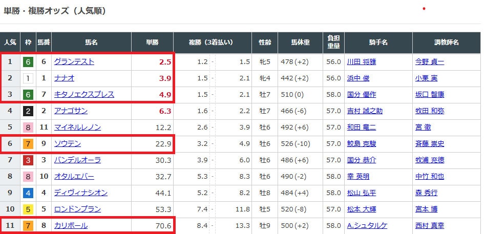 単勝3番人気の⑦しか買えておらず1つも当たりませんでした。