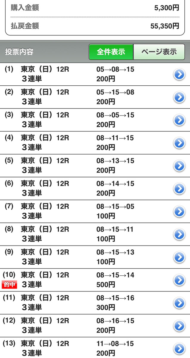 この時点で50万越えとジャパンカップは管理人田中の気が緩み、指定されたジャパンカップ買い目にプラスして遊び買い目を追加して買ってしまいましたが⑧-⑤-①的中!