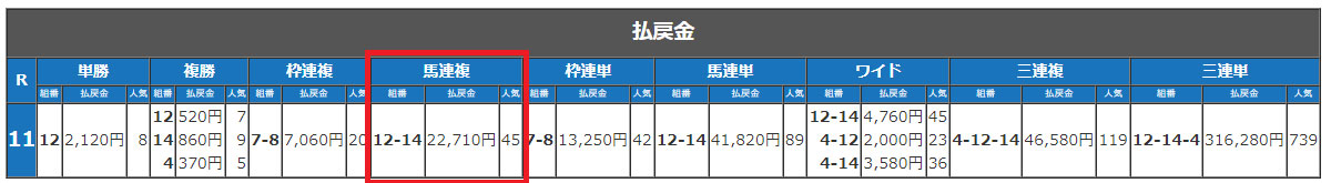 軸に置いていた⑫が無事に1着に来てくれて、2着に⑭と予想どおりの結果に。