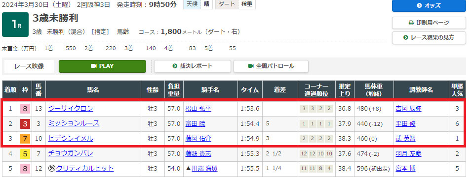 軸に置いた⑩が3着に滑り込み、相手に据えた③⑬が1着2着と馬券に絡む着順で予想どおりの結果に。