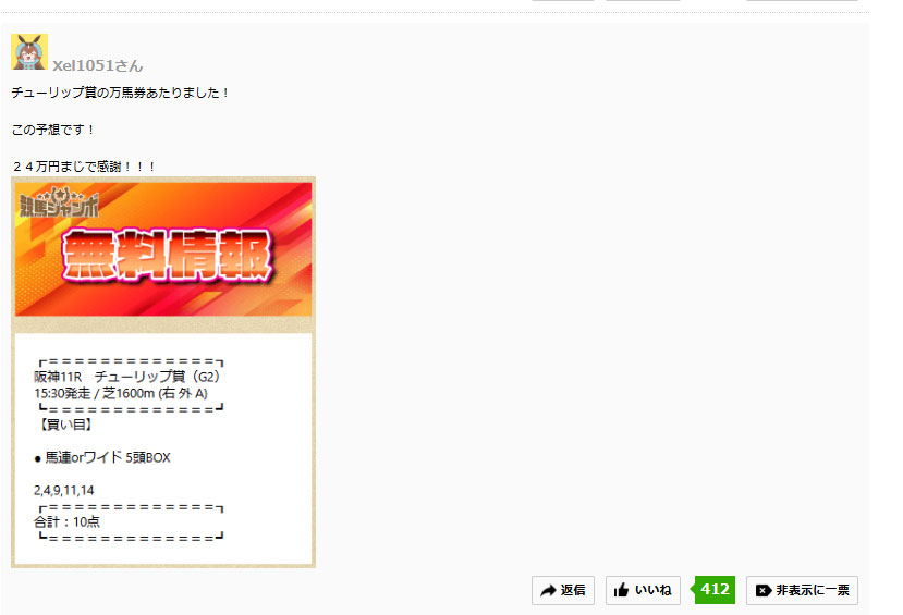 そこで弥生賞ディープインパクト記念(G2)を的中させたサイトの口コミを見つけたでのご紹介したいと思います!