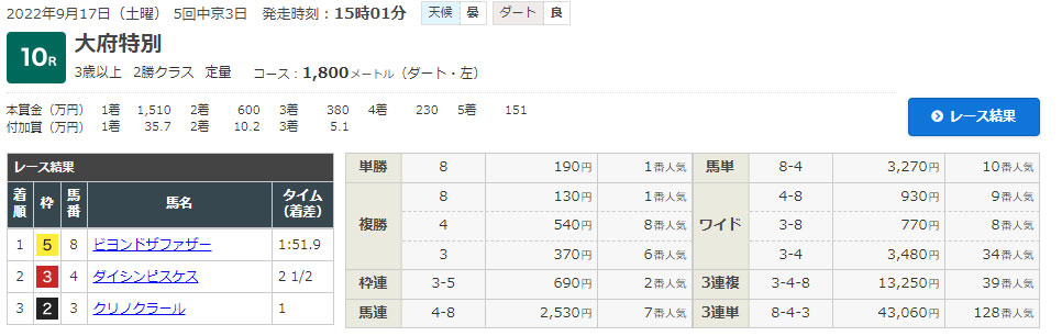 軸の⑧ビヨンドザファザーが道中は反応がイマイチでしたが最後は圧勝の差し切りで1着になり、2・3着に相手に入れていた③と④の馬がそれぞれ馬券に絡み的中しました!