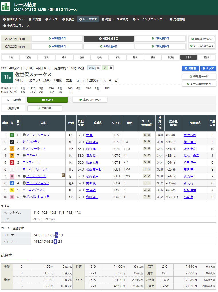 ばかうけが無料情報として公開していたレースは小倉11R、メイン競争の佐世保ステークスだ。