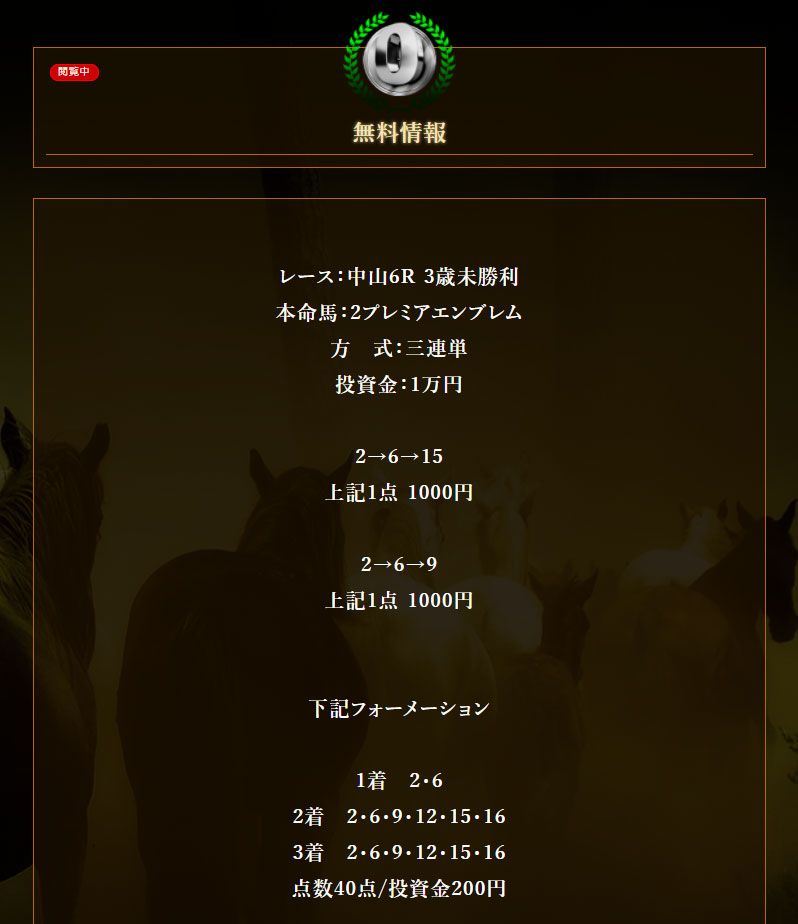 3日間開催最終日のすばるS予想は点数40点に対して馬券に絡んだ競走馬は“0頭”前日同様に人気馬を頭に流したフォーメーション、基本的に1~5番人気をフォーメーションで組むだけとあまり参考にならないサイト、そして不的中なら使う余地がないと断言できる質の情報と言えます。