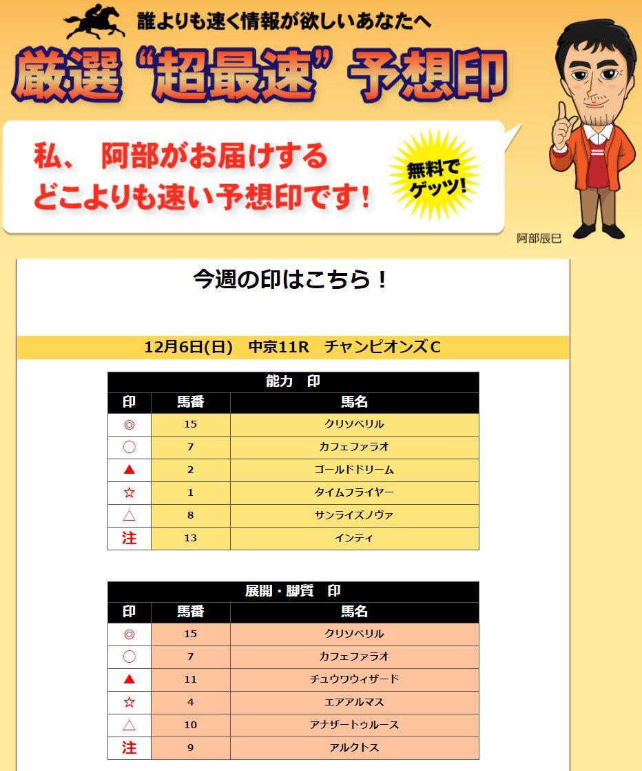 芸能人の『アベヒ○シ』ならぬ阿部辰巳というコンセプトからして胡散臭さが出ているサイトなのでご使用はお控えになり、競馬リポート内の口コミで会員様が的中を獲られている優良サイトをご使用する事をご推奨致します。