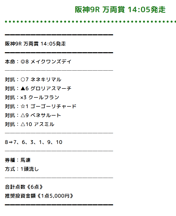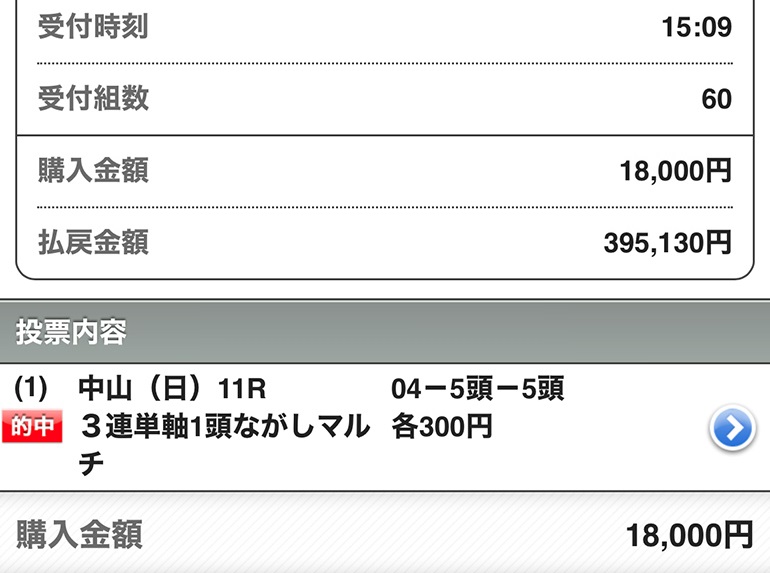 年末に最高の的中もらえました、しかも期間限定の無料情報。 よっぽどの自信の表れが配当でした。 1点100円~が推奨でしたけど点数も10点で少なかったから1点千円購入 年末最終日に15万200円ゲット、1/1の予想も当たってました。 2-6 1,930円 21人気 1-6 9,370円 51人気 1-2 3,720円 31人気