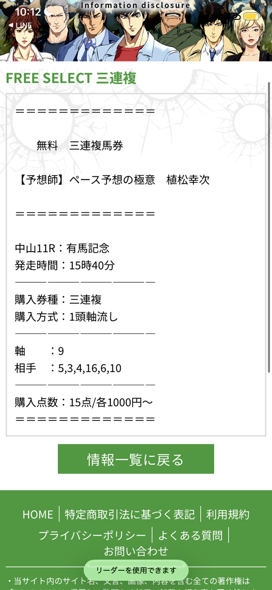 競馬リポートさんが推奨していたエフセレクトの無料情報試してみました。 暮れの大一番、有馬記念の無料予想は嬉しいかったです。 まさかの1番人気レガレイラが馬券外はビックリでした。 3連複万馬券的中【165.8倍】1点千円、合計馬券代1万5000円が16万5800円になりました!! 無料でこれだけ当たるなら有料情報は「当たる」にプラスして配当も狙えそうな気がしますね~!!