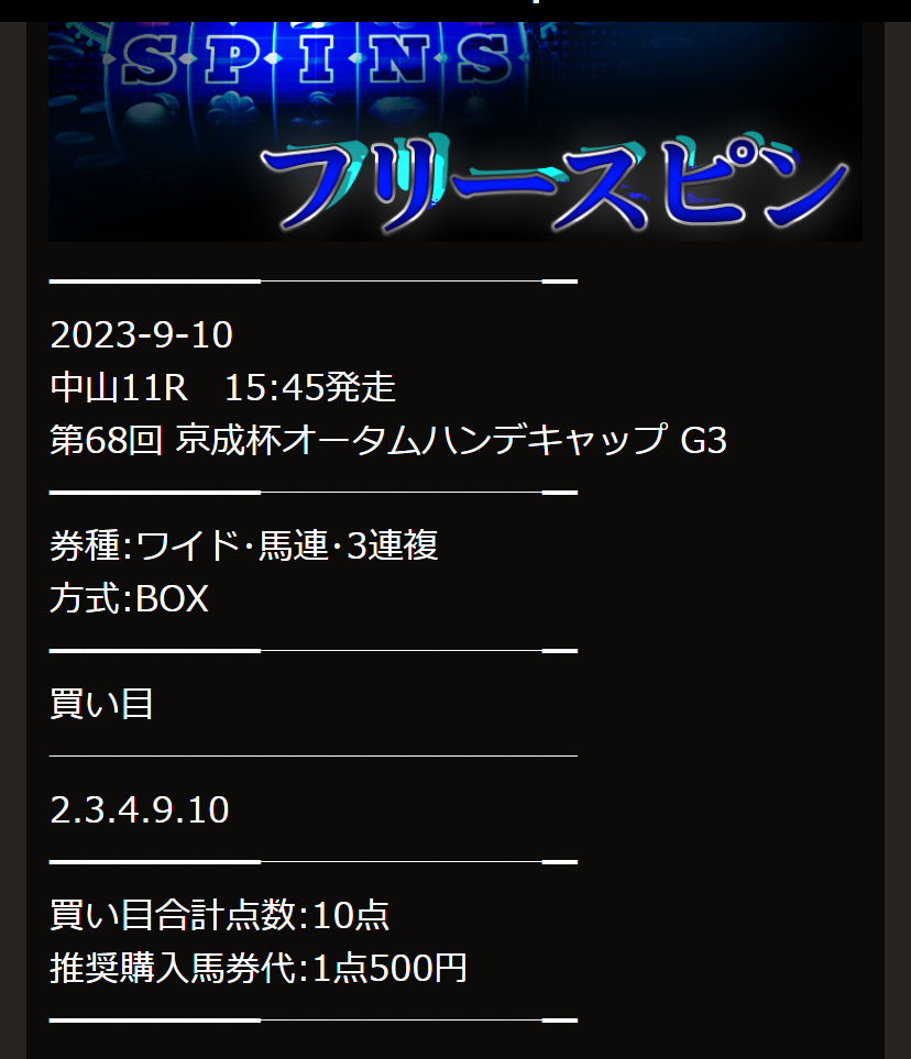 先週の土曜日8/27日曜日に無料情報だけで15万150円ゲットできたから今週の無料情報公開も楽しみにしてます! 今週も10万OVER的中したら貯まった配当で有料情報参加してみたいと思います!