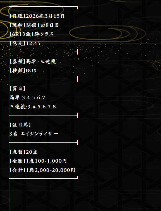 中山4Rの予想は1万3200円とそこまで配当高くなかったけど続く阪神8Rの予想では7万9200円とめっちゃ満足! G1資金集められてそのG1も当てられて一石二鳥の競馬サイト見つけたわ!