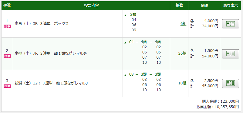 俺みたいな乞食は3連複で1点200円しか賭けてないけど852.4倍も付いたから17万480円払い戻しでした。