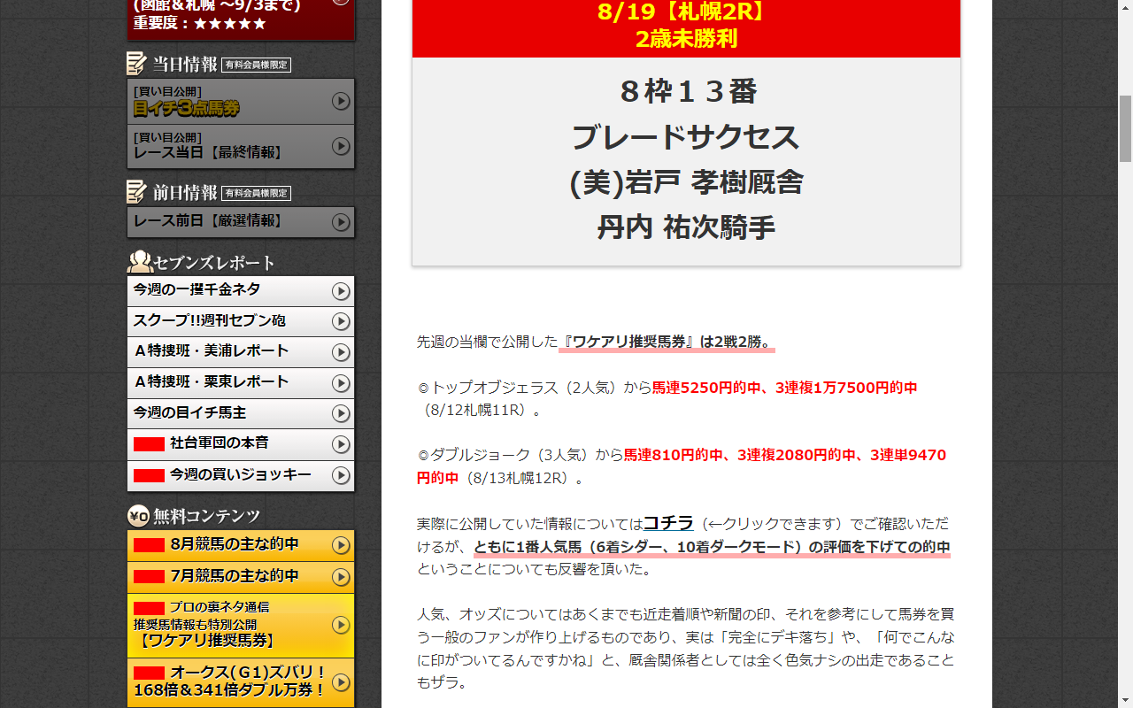 6月25日まで会員なのに、函館情報は、別情報料支払った方のみ提供。 私にはとても支払えない情報料金。大々的に函館でも「的中」を出した。 皆さんは、このような営業方針、どう思いますか? 貧乏人には「別次元」